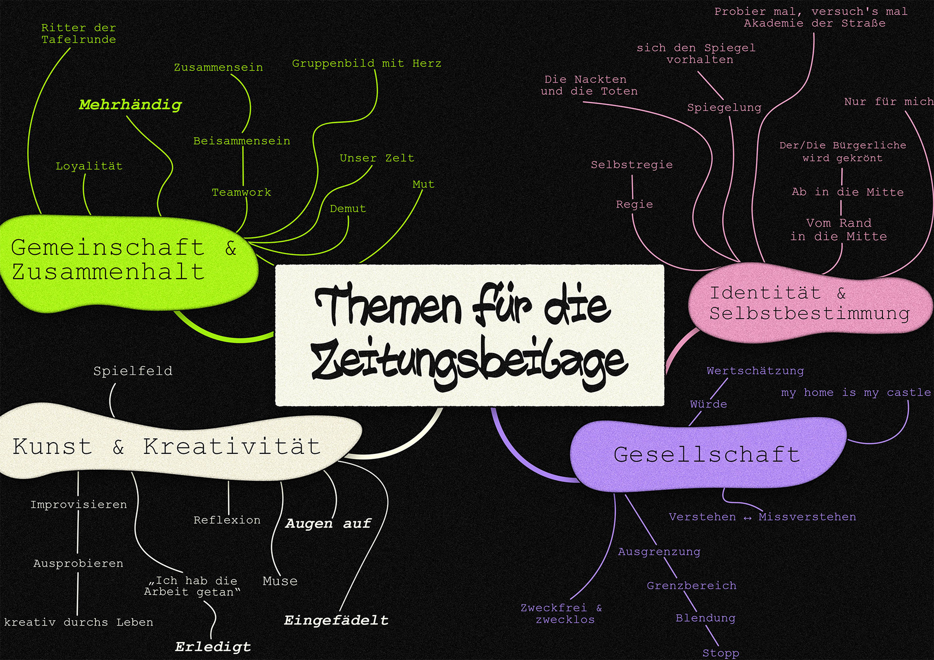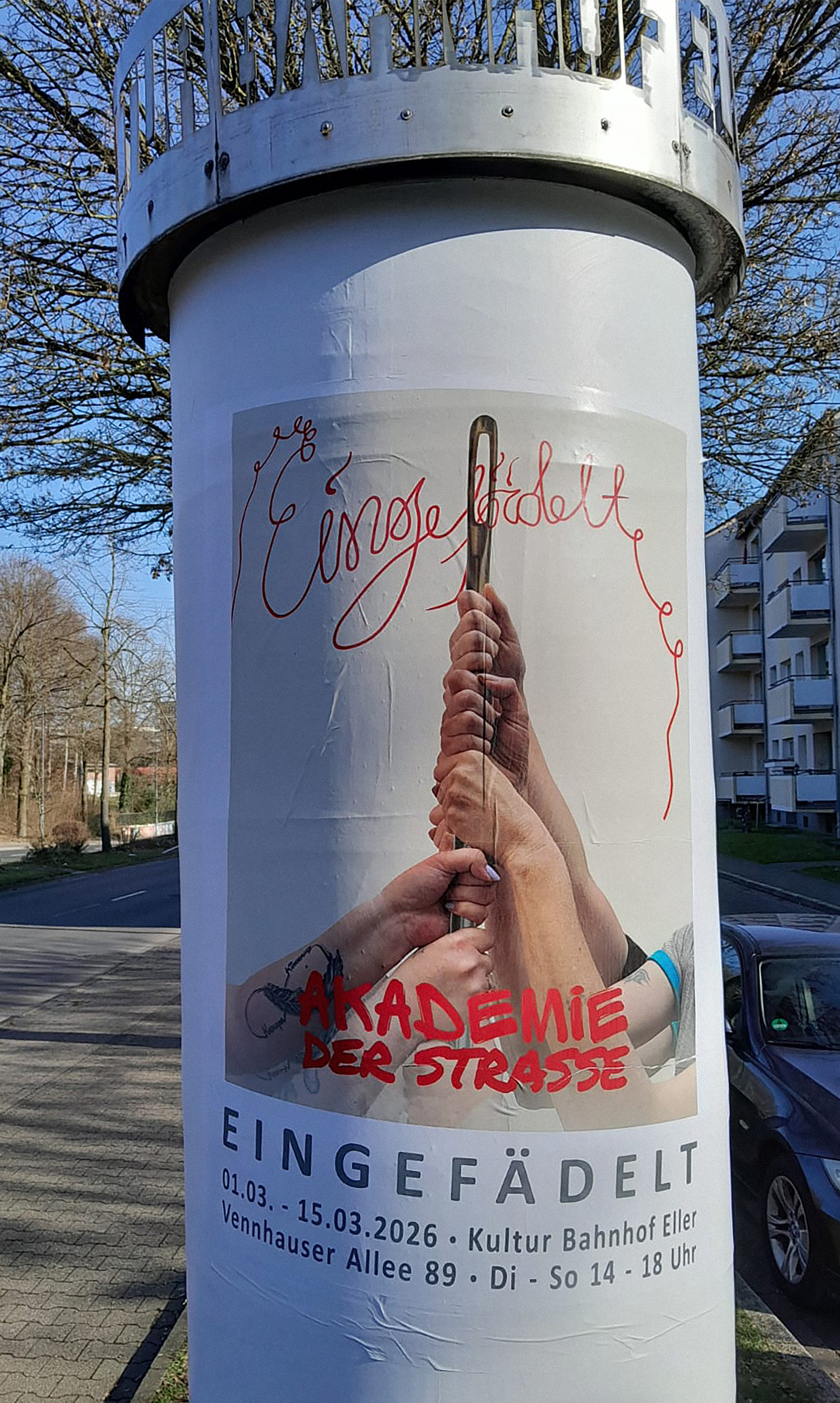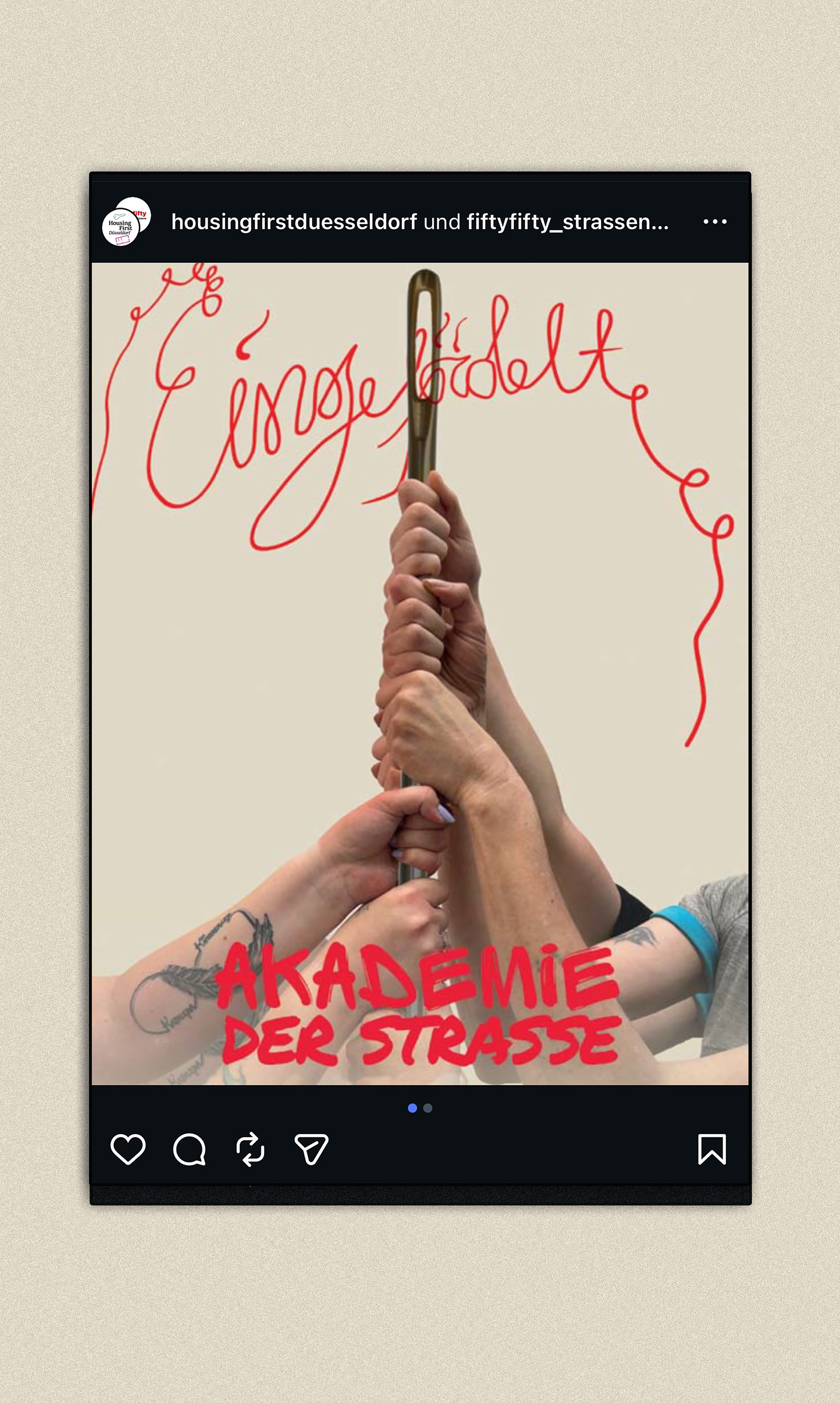 Im Rahmen meiner Zusammenarbeit mit fiftyfifty, dem Straßenmagazin aus Düsseldorf, habe ich das Layout für einen Beileger der Akademie der Straße gestaltet. Außerdem führte ich Interviews mit Teilnehmenden und verfasste daraus biografische Texte, die Einblicke in ihre Lebensgeschichten geben. Zusätzlich organisierte ich eine Kunstausstellung im Rahmen der Düsseldorfer Kunstpunkte, bei der Arbeiten der Akademie präsentiert wurden.